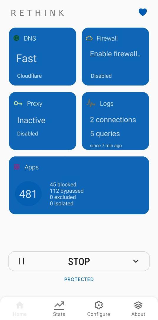 After enabling blocklists, your device should start blocking ads and trackers immediately. You can check this in the home screen of Rethink, in the Apps card (Fig. 2). To learn more about Rethink and its advanced features, visit its official website.
