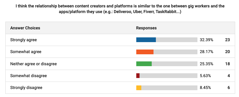 Comparing content creators and gig-economy workers was the assumption that we wanted to test the most. While the results are hindered by the somewhat limited number of responses, it seems clear that content creators surveyed agree with this vision.