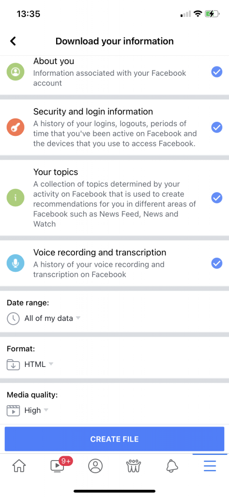 Depending on the amount of information that Facebook has on you will determine the amount of time it will take to prepare the file. Once the file is ready for download, you will receive a Facebook notification on the Facebook app.