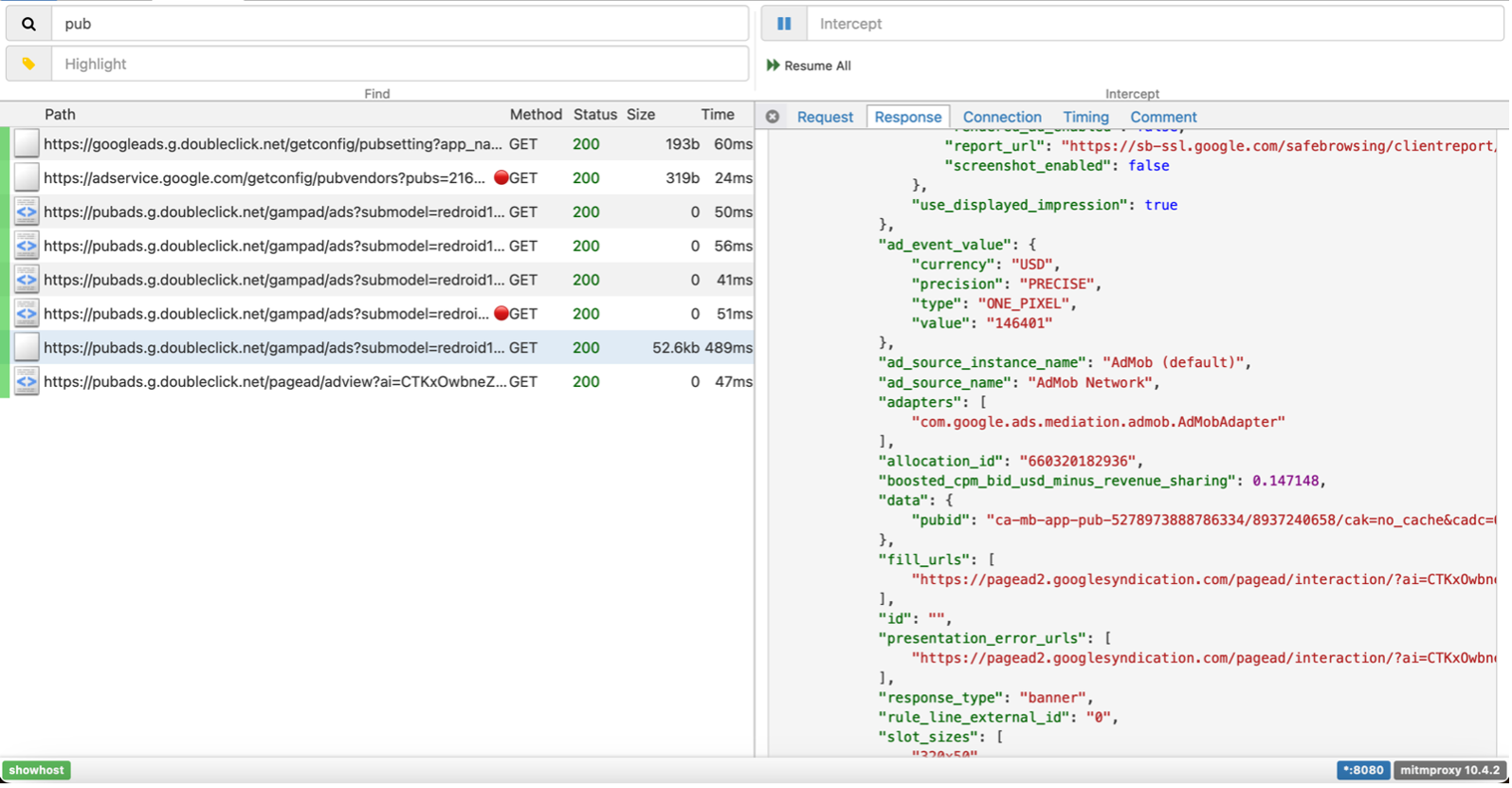 Other ads SDKs we observed were advertising network calls through Pub Ads (acquired by Google), which requested device data and responded with a variety of ad placement information: