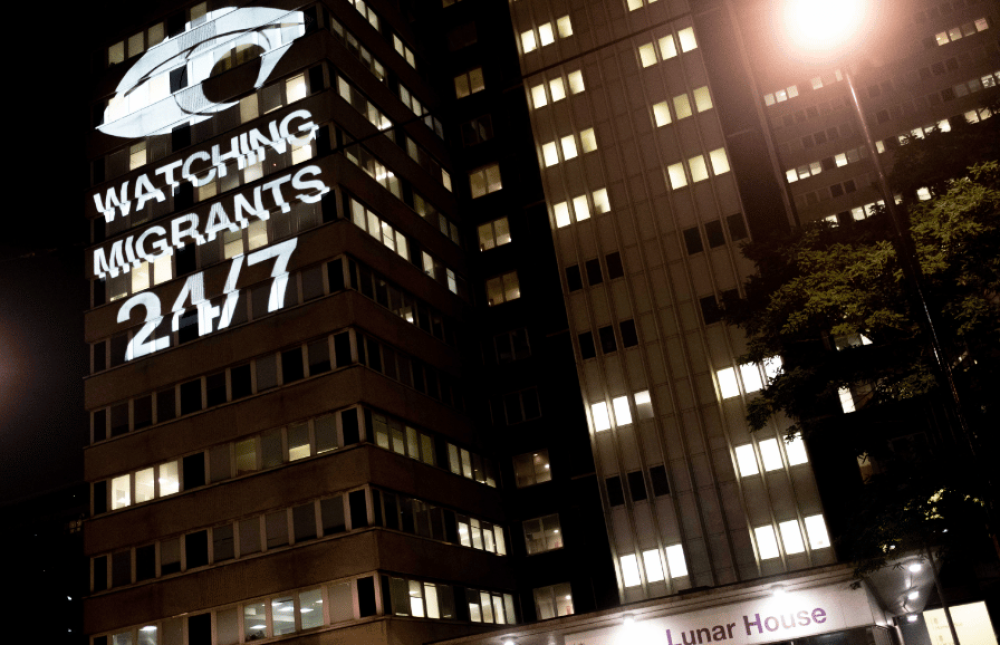 Home Office building Lunar House, light projection June 2022 (copyright Privacy International, projection design Holly Mina Jones)