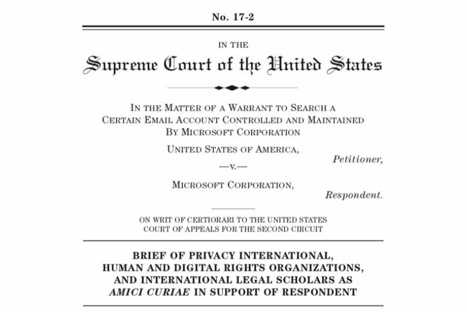 On 18 January 2018, Privacy International, together with 26 human and digital rights organizations and legal scholars, filed an amicus brief to the United States Supreme Court in United States v. Microsoft Corp. This case stems from the U.S. Government’s attempt, pursuant to a warrant obtained under the Stored Communications Act, to compel Microsoft to hand over emails and other private information associated with a particular account. Much of the data is stored in Ireland and Microsoft refused to hand over that data on grounds that the Stored Communications Act does not authorize the U.S. Government to unilaterally seize data stored extraterritorially.