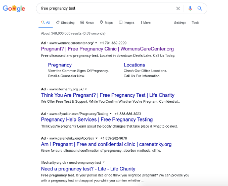 Below are some examples of Google ads running on search terms such as “free pregnancy test” and “abortion”.
