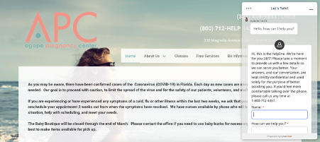 Example of crisis pregnancy centre website developed by Heartbeat International’s Extend Web Services, and with the Option Line chat open.