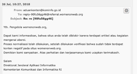 ELSAM told PI that the above screenshot shows the reply from the ministry administrator. It says “We wanted to inform you that your site has been blocked for posting an article or activity related to abortion. The normalisation [reinstatement] process has been undertaken after we conducted a verification confirming the removal of negative contents posted in womenonweb.org.”