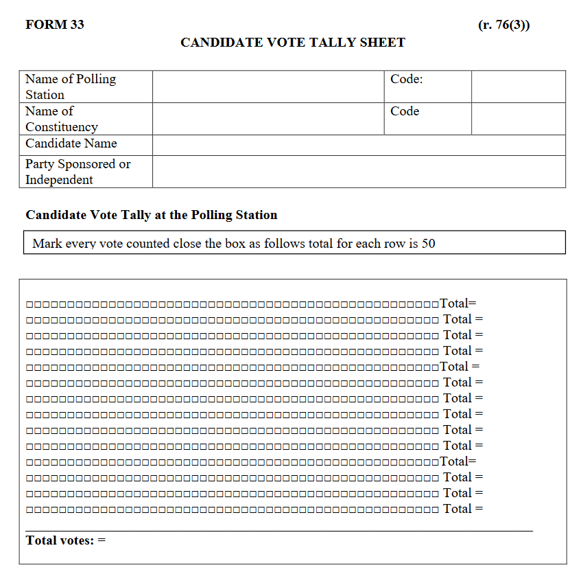 - Fill out the result on the tallying sheet (Form 33 in the Regulations Schedule)