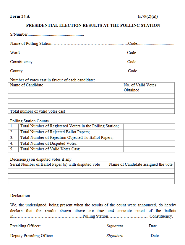 In addition to Electronic Voter Identification, the tablets were to be used for provisional results transmission. After filling out the official results form (Form 34A), the presiding officer at each station was to key into the tablets the numeric results, together with a scan of the form - referred to as a Bundle. During testing it had been demonstrated that the send icon on the tablet was disabled until the scanned form had been added[https://nation.africa/kenya/news/politics/IEBC-tests-results-transmission/1064-4042450-lpl4hmz/index.html].