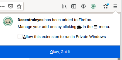 Upon successful installation a notification appears on the top-right corner, and the Decentraleyes icon is added to your toolbar (Fig. 3). When you visit a website, Decentraleyes automatically blocks connections to third-party CDNs and injects the assets locally, which you can check by clicking the icon (Fig. 4).