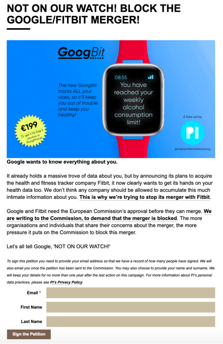So, we launched a public petition against the Google/Fitbit merger within a couple of days of it being announced to the European Commission. With the support of eight CSOs around the world [Access Now, ARTICLE 19, Derechos Digitales, EDRi, Hellenic Association of Data Protection and Privacy, Homo Digitalis, Idec (Brazilian Institute of Consumer Defense) and Unwanted Witness], we coordinated a social media campaign to warn about 'Googbit', a fictional dystopian smart watch. Googbit would link together your health data with a range of other Google products and services e.g. ‘You have been depressed for a month. Buy this book from the GoogStore because I think it will lift your mood’ etc. It’s a bit like the operating system in the film ‘Her’, but without the romantic entanglement.