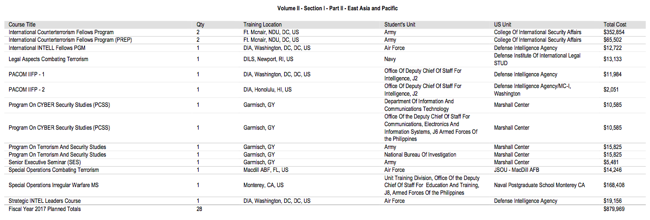 Some US agencies engaged in financing and training foreign security agencies also provide data to the US aid transparency portal, foreignassistance.gov. This includes the Departments of Defense, State, Interior, Justice, and Homeland Security. For example, it’s possible to get a breakdown of appropriated funds for specific agencies, projects, and countries – such as DoD Train & Equip programmes around the world, or the work which Immigration and Customs Enforcement (ICE), does with other security agencies around the world.