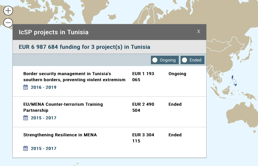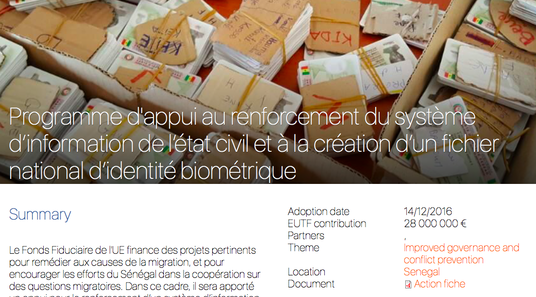 The European External Action Service, the EU’s foreign policy body, manages various funds; the Emergency Trust Fund for Africa for example, with an allocated budget of €3.3 billion, supports 26 countries to improve resilience to food insecurity, support job creation, and address human rights abuses. A key focus of the fund is migration, for example committing €28 million to develop Senegal’s nationwide biometric system (implemented by a private security company formerly part of the French Ministry of Interior). The projects are available under the various thematic and regional webpages.