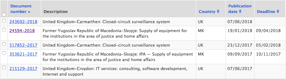 Individual countries also make publicly available procurement data, such as the Bangladeshi national procurement site, here showing various tender notices for various surveillance equipment.
