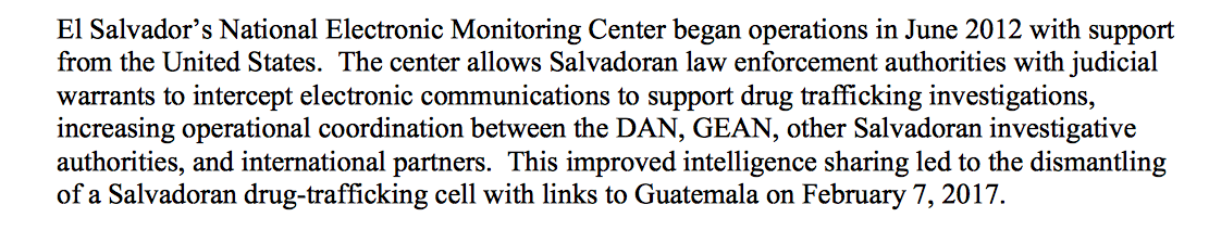 Specific US agencies and programmes sometimes provide their own publicly-available audit reports. For example, US Department of State Bureau of International Narcotics and Law Enforcement Affairs (INL) works with foreign security agencies with the mandate of reducing “the amount of crime and illegal drugs reaching U.S. shores.” The agency produces annual reports detailing US counter-narcotics strategy, which outlines trends and US facilitation of capabilities abroad, as well (up until 2009) as end-use monitoring reports, which for example shows INL funding for telecommunications wiretapping in Uruguay.