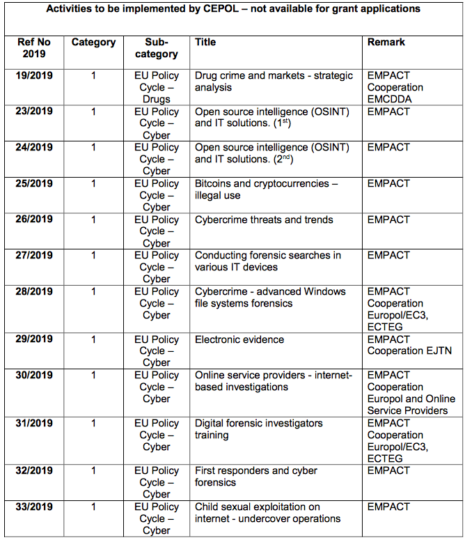 Example of training courses implemented by the European Union Agency for Law Enforcement Training