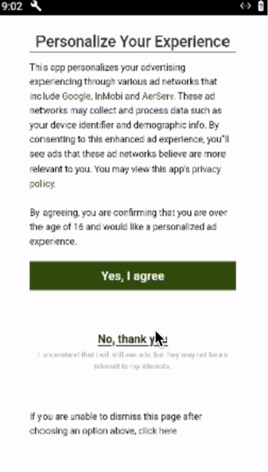 We indeed got started on the app without having to create an account and without having to complete any onboarding questionnaire. Then, we were presented with a consent pop-up for the processing of user data for networks like Google, InMobi and AerServ. We clicked 'No, thank you' (Figure 4.1), which confirmed that 'Ad networks won't collect data to personalise advertising for you in this app' (Figure 4.2).