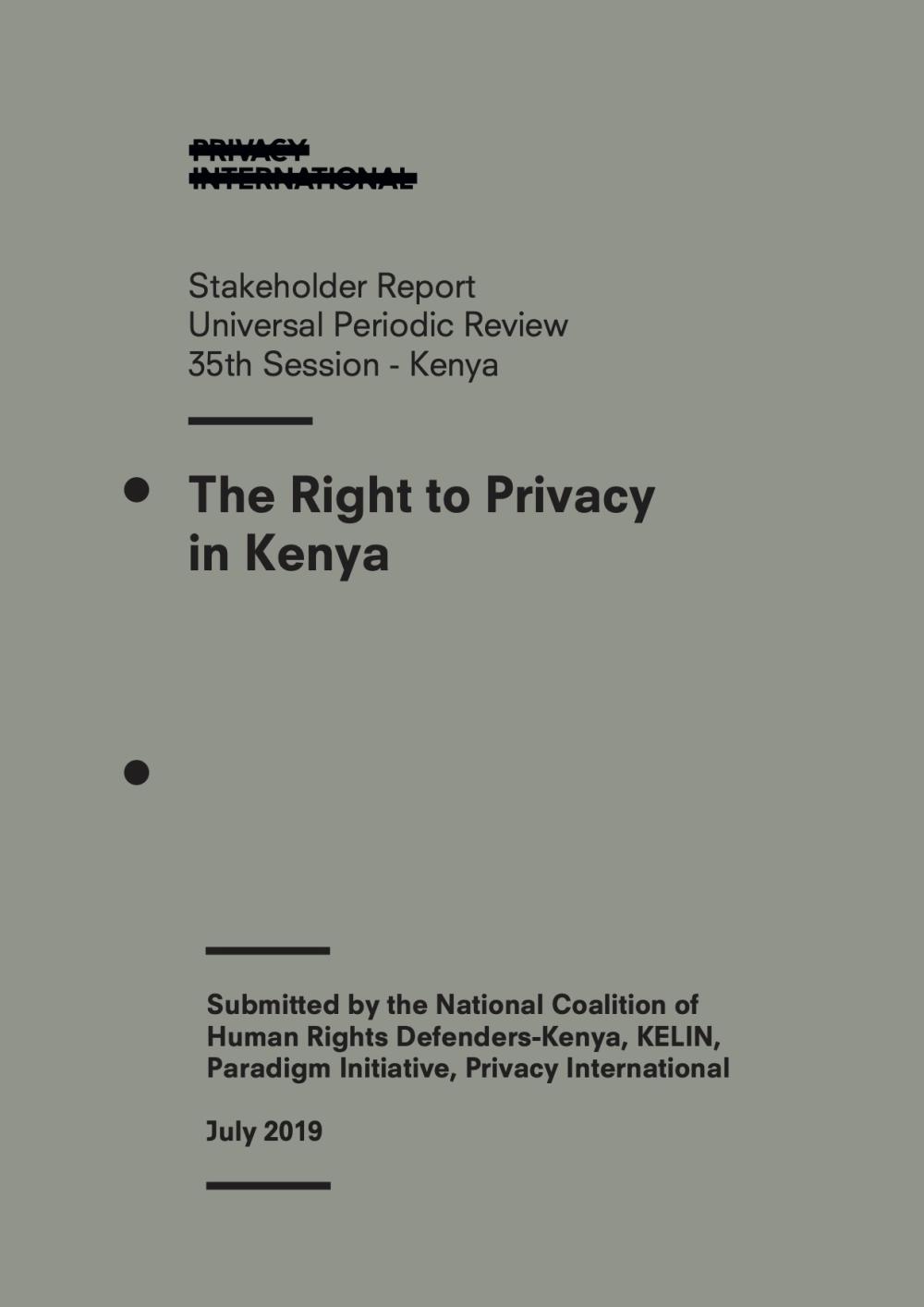 This stakeholder report is a submission by Privacy International (PI), the National Coalition of Human Rights Defenders Kenya (NCHRD-K), The Kenya Legal & Ethical Issues Network on HIV and AIDS (KELIN), and Paradigm Initiative.