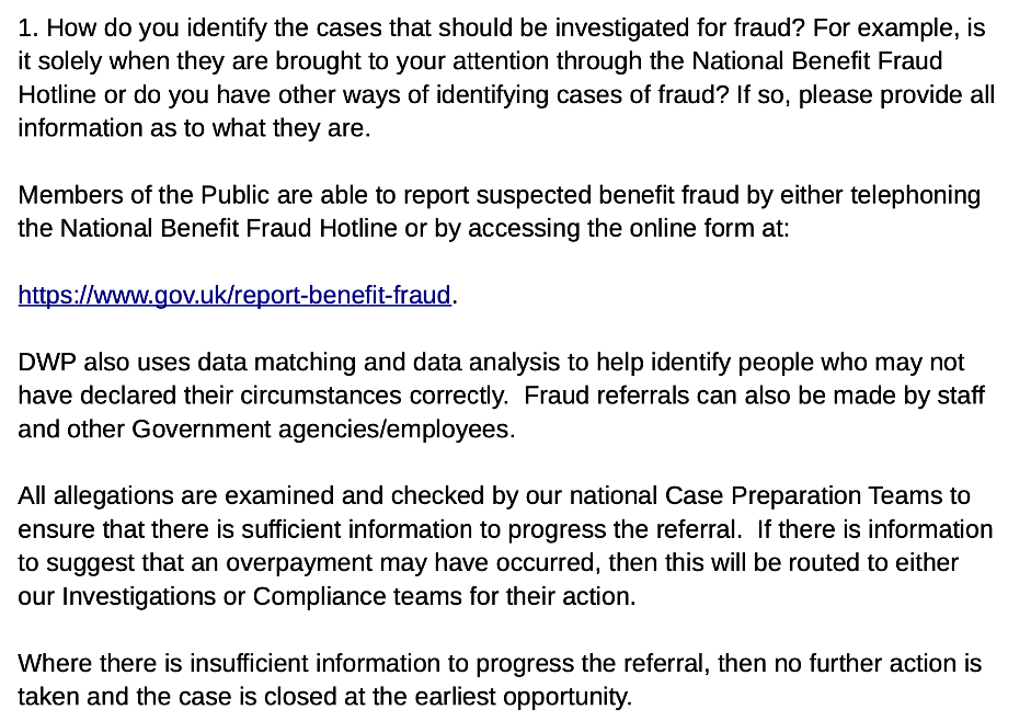The first part of the response from the DWP suggested that investigated cases are first flagged by members of the public who inform on their neighbours, relatives, etc… While we do not doubt some people are willing to call the authorities to snitch on a neighbour who is going on holidays while receiving benefits, we suspected this may not be the primary and most regular way cases are flagged, as people who call to inform on others may not always be the most reliable source of information. This is why the data matching and data analysis system they mentioned caught our attention. While data matching and data analysis do not necessarily suggest the use of advanced artificial intelligence, it was clear however that an algorithm of some sort was being used. We therefore asked the DWP:
