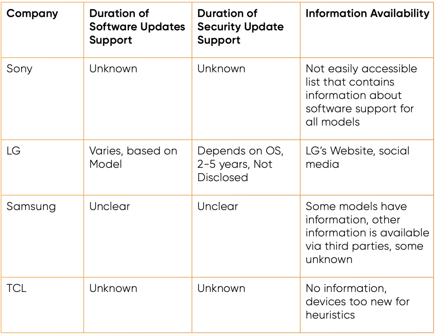 In general, the software or security support duration for smart TVs appeared to be quite unclear and, at times, unknown, with software or security updates varying across manufacturers, and depending on model or operating system. Moreover, information regarding software or security updates was frequently either absent from or extremely hard to locate on the companies' websites. This can accordingly add an extra layer of confusion for consumers as they might have to rely on unofficial, third-party websites for this information.