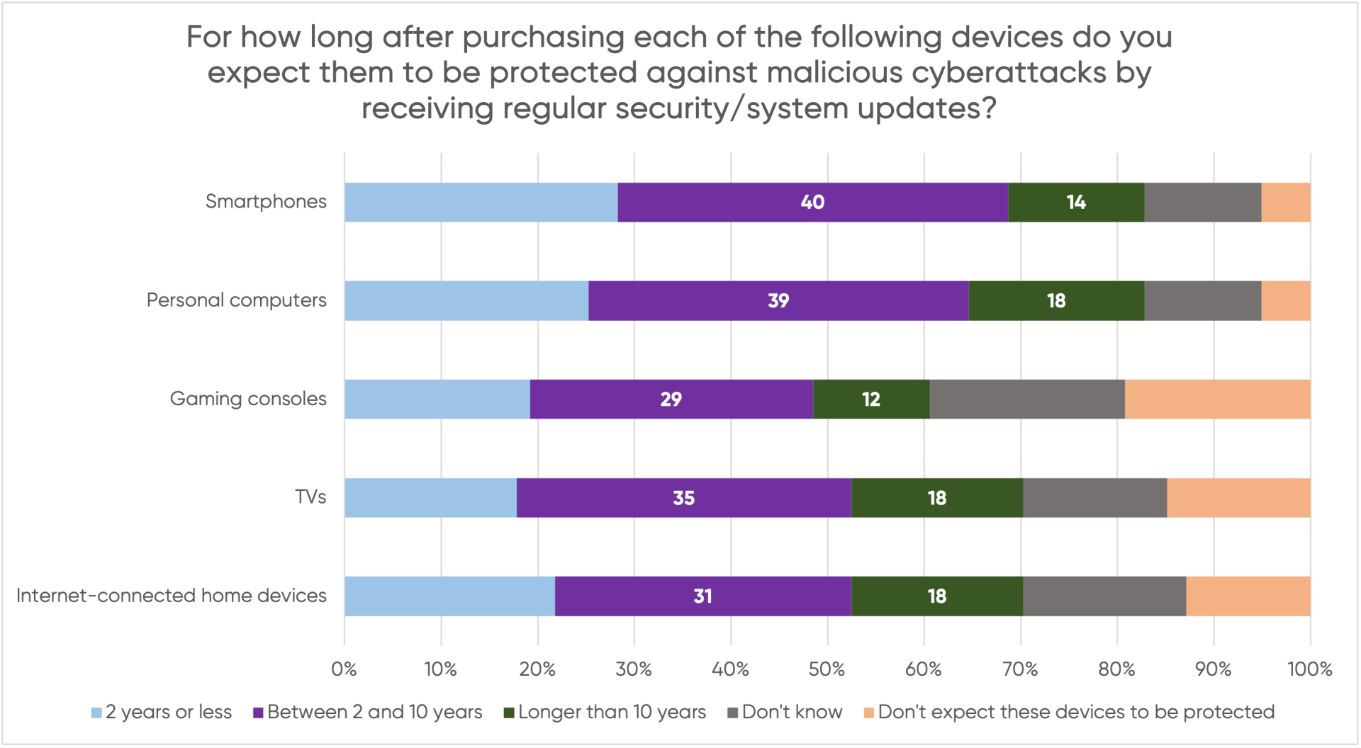 The trends identified below seem to stand in contradiction to what EU consumers believe about the duration of security updates for their smart devices. In August 2022, PI commissioned a YouGov survey across consumers from five EU member states (Italy, Poland, Germany, Spain and France). The survey results confirm that consumers expect their connected devices to receive security updates for a much longer period than what several device manufacturers currently offer. Specifically, the vast majority of consumers expect their devices to be protected beyond 2 years (55% for smartphones, 57% for personal computers or tablets, 41% for gaming consoles, 53% for TVs and 49% for internet-connected home devices believed that the device would be protected beyond 2 years on average).