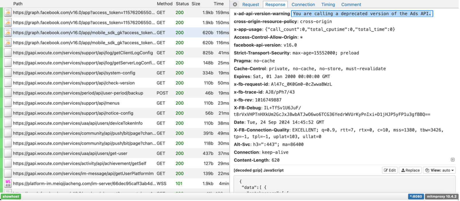 We also noticed several calls to Facebook's Graph API. Similar to WomanLog and Maya, there appeared to be a gatekeeper check in the call to Facebook, and the response included a list of the SDK features used by the app (Figure 6.12).